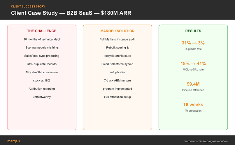 When this SaaS company engaged marqeu, their Marketo instance had accumulated 18 months of technical debt following a rapid headcount reduction in marketing operations. Scoring models were firing incorrectly, the Salesforce sync was producing duplicate records at a rate that was distorting pipeline reporting, and the team had essentially stopped trusting any data that came out of Marketo.