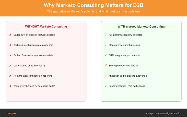 For marketing operations leaders who need senior-level strategic guidance on scoring model design, attribution architecture, tech stack optimization, or team capability development our advisory model provides access to marqeu's senior consultants on a fractional basis. This model works well for organizations with capable internal teams who want expert input on the decisions that most directly affect Marketo ROI.